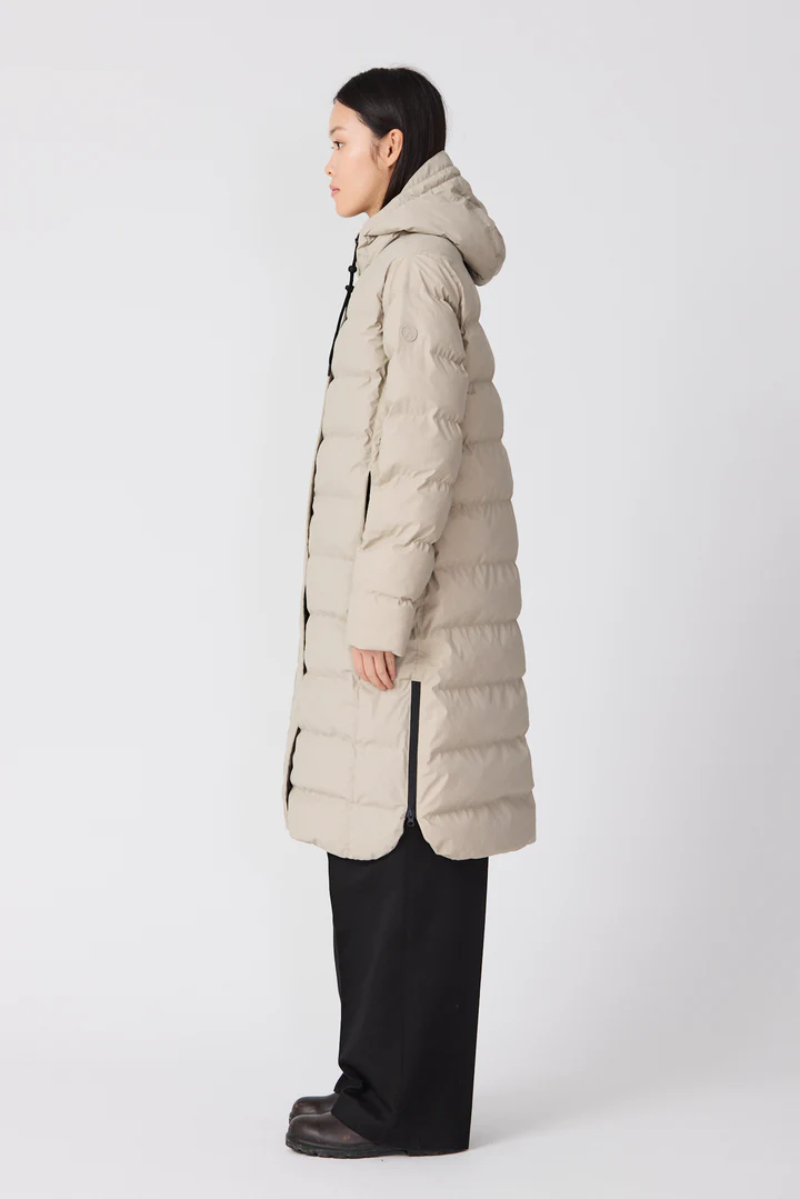 Abrigo acolchado impermeable. Costuras selladas y corte recto.
