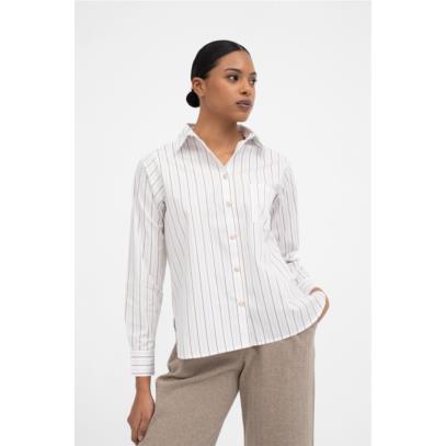 Camisa de rayas de algodón con cuello camisero con canesú y bolsillo en el pecho. Tiene aberturas laterales y puño doble con botón.