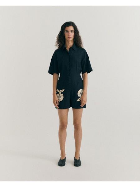 Mono con parches de pececitos, cierre con botones, corte camisero.