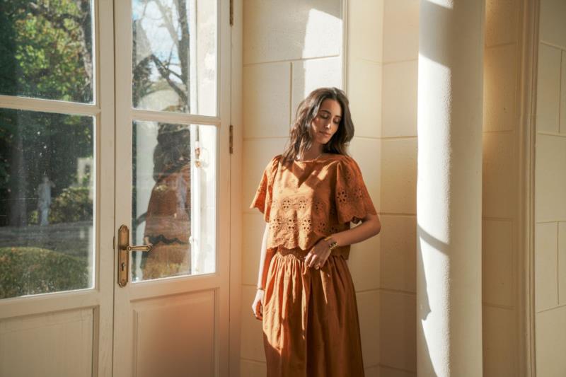 Blusa troquelados con doble postura, atada a la espalda o delante, combínalo con la falda.