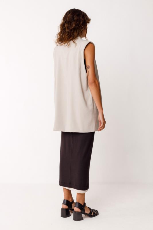 Chaleco largo sin mangas de cuello asimétrico, diseñado en colaboración con la artista Stéphanie Caillaud.