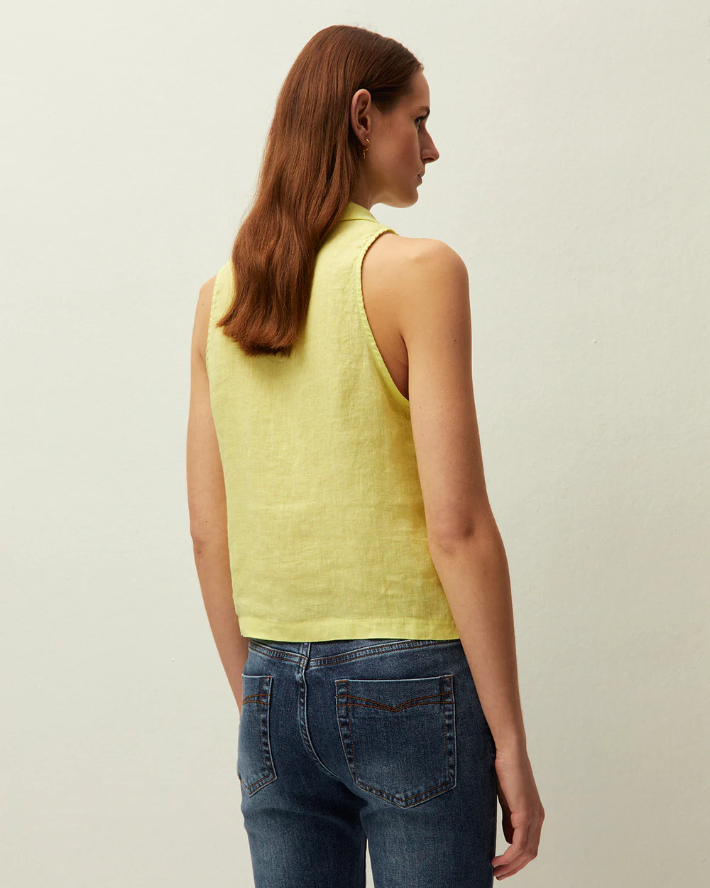 Chaleco de lino con cuello camisero y pinzas en el pecho. Combínalo con los pantalones,