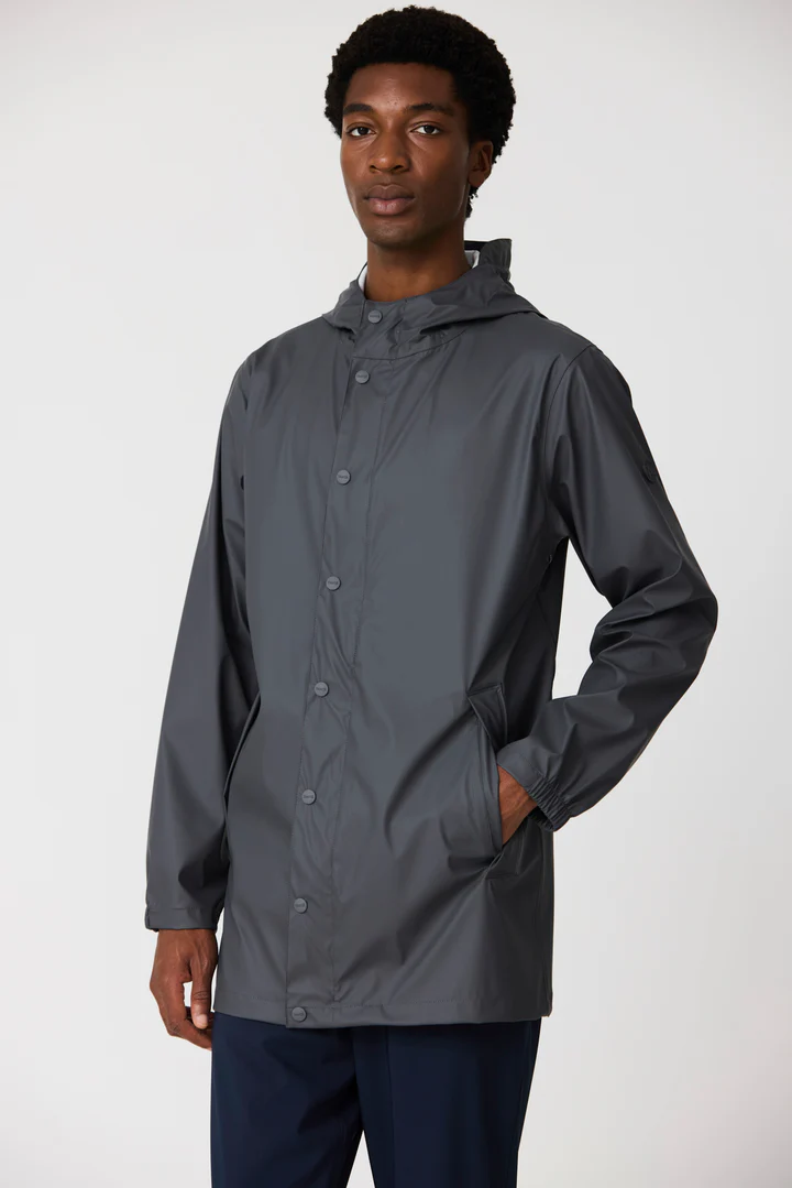 Impermeable ligero confeccionado en PU fino, diseñado con un corte regular y largo medio.