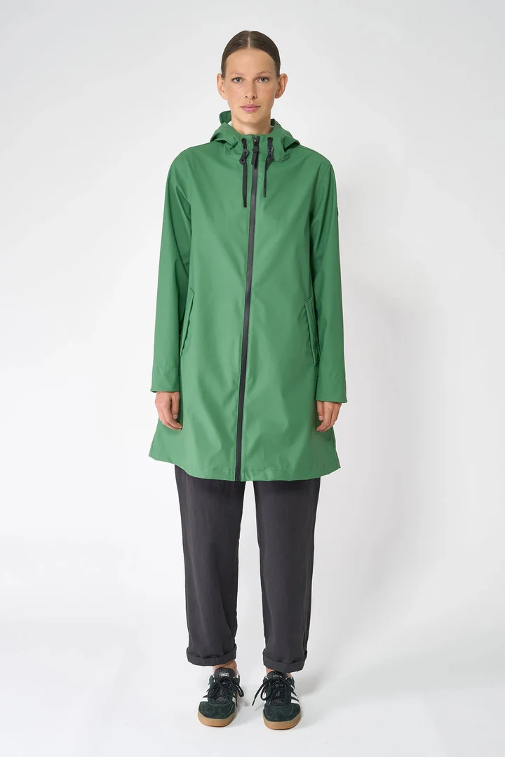 Impermeable de mujer en poliuretano con pliegue en la espalda y volumen en forma de A.