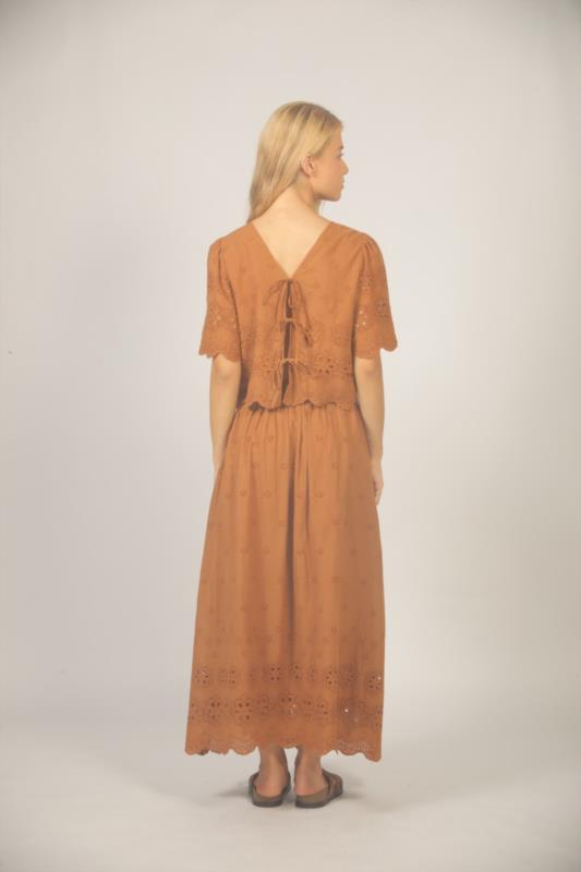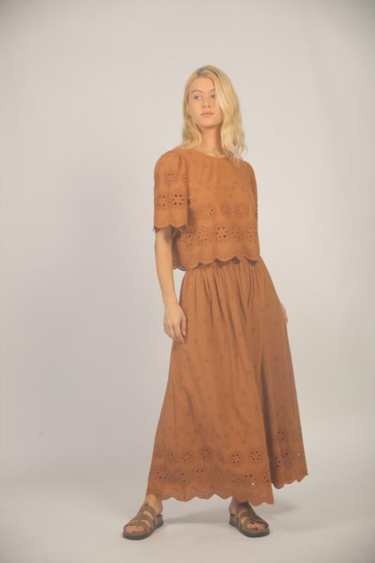 Falda midi troquelada con goma en cintura y bolsillos. Tiene forro. Combínala con la blusita.