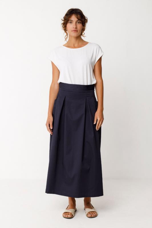 Falda midi bolsillos laterales parche, cierre con cremallera.
