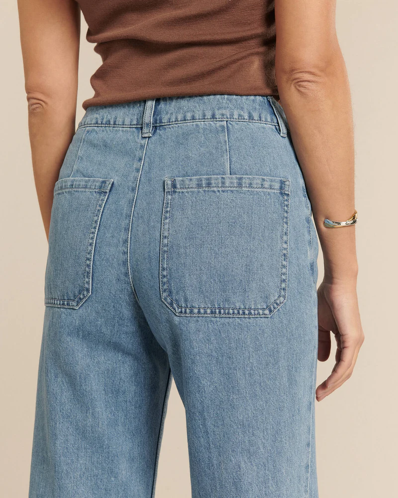 Pantalón corte holgado recto, cintura alta, bolsillos traseros parche. 100% algodón.