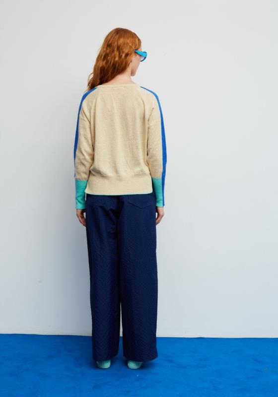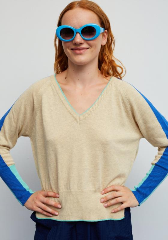 Jersey de cuello pico color beige con contrastes azul klein. Corte regular, manga larga y aperturas en el bajo laterales.