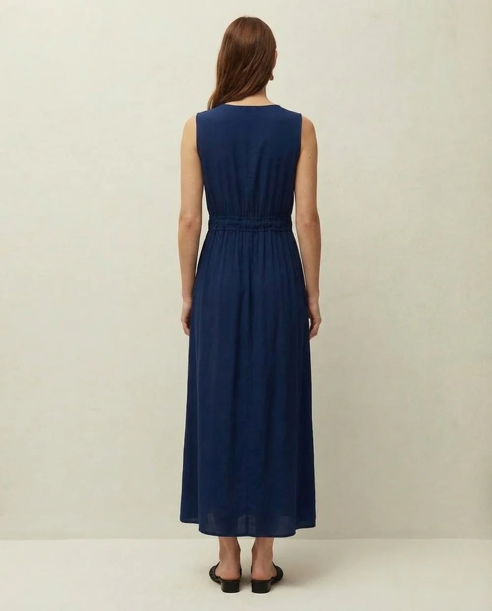 Vestido sin mangas largo fluído con cordón bajo pecho.