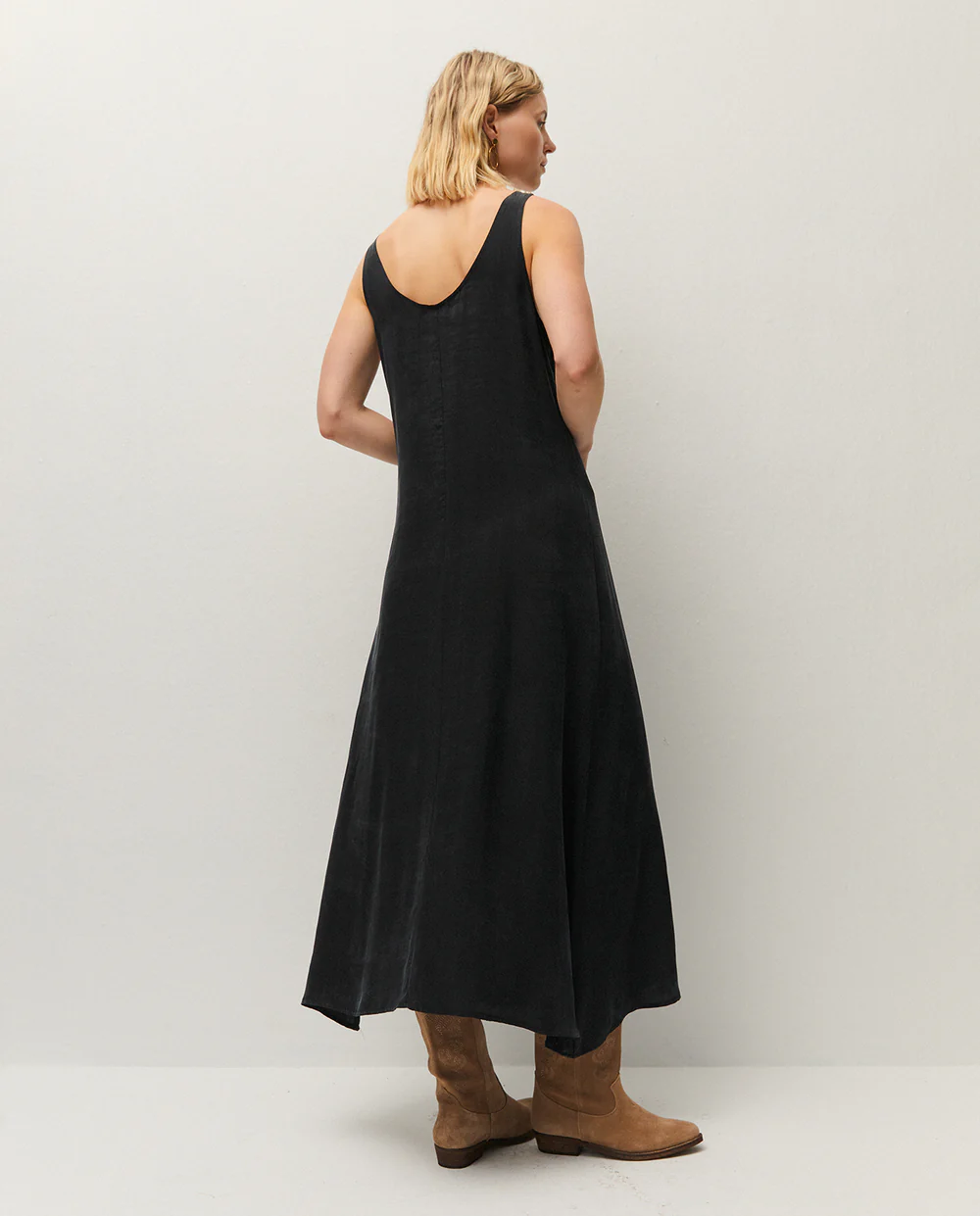 Vestido evasé fluído tirantes con escote redondo trasero.